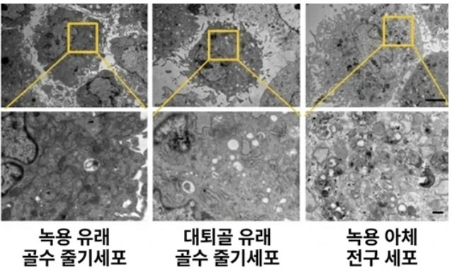 위 사진을 보시면 명확합니다. 오른쪽 녹용 세포 안에만 유독 검은 점들이 빽빽하게 들어있는 것이 보이시나요? 저것이 바로 뼈를 재생하고 염증을 줄이는 귀한 성분들이 가득 담긴 ‘소포체’입니다. 과학자들은 이 성분이 녹용의 놀라운 재생 능력의 비밀임을 밝혀냈습니다.