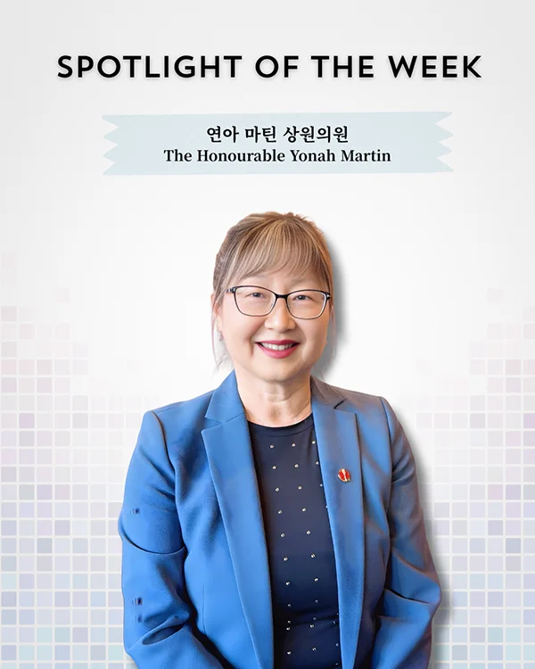 연아 마틴(The Honourable Yonah Martin) 상원의원은 2009년 임명된 캐나다 헌정 사상 최초의 한인 국회의원이다. 21년간의 교직 생활을 거쳐 정계에 입문한 후, 상원 야당 부대표와 정부 부대표 등 요직을 역임하며 탁월한 리더십을 발휘해 왔다. 특히 ‘한국전 참전용사의 날’ 제정과 ‘한-캐 FTA’ 체결에 중추적인 역할을 했으며, 최근 ‘한국 문화유산의 달’ 지정을 이끌어내는 등 캐나다 내 한인 사회의 위상을 높이고 양국 간의 가교 역할을 하는 데 평생을 헌신해 온 대표적인 정치 리더이다.