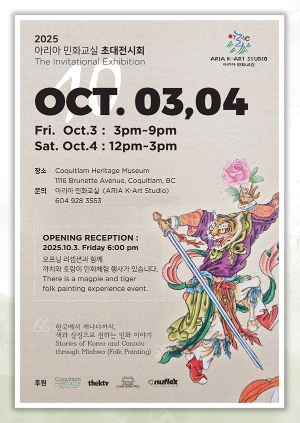‘2025 아리아 민화 초대전(The Invitational Exhibition)’이 오는 10월 3일(금)과 10월 4일(토) 양일간, Coquitlam Heritage Museum에서 개최된다.